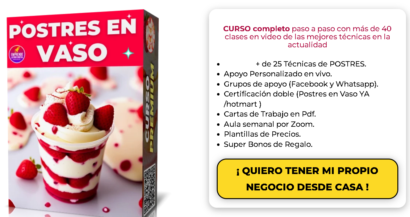 Aquí aprenderás desde cero el arte e los postres en vaso como hacer los rellenos como chantilly y más de 25 técnicas y diseños en postres en vaso galletas, choco-torta, rebanadas en pastel y como crecer tu emprendimiento desde casa.